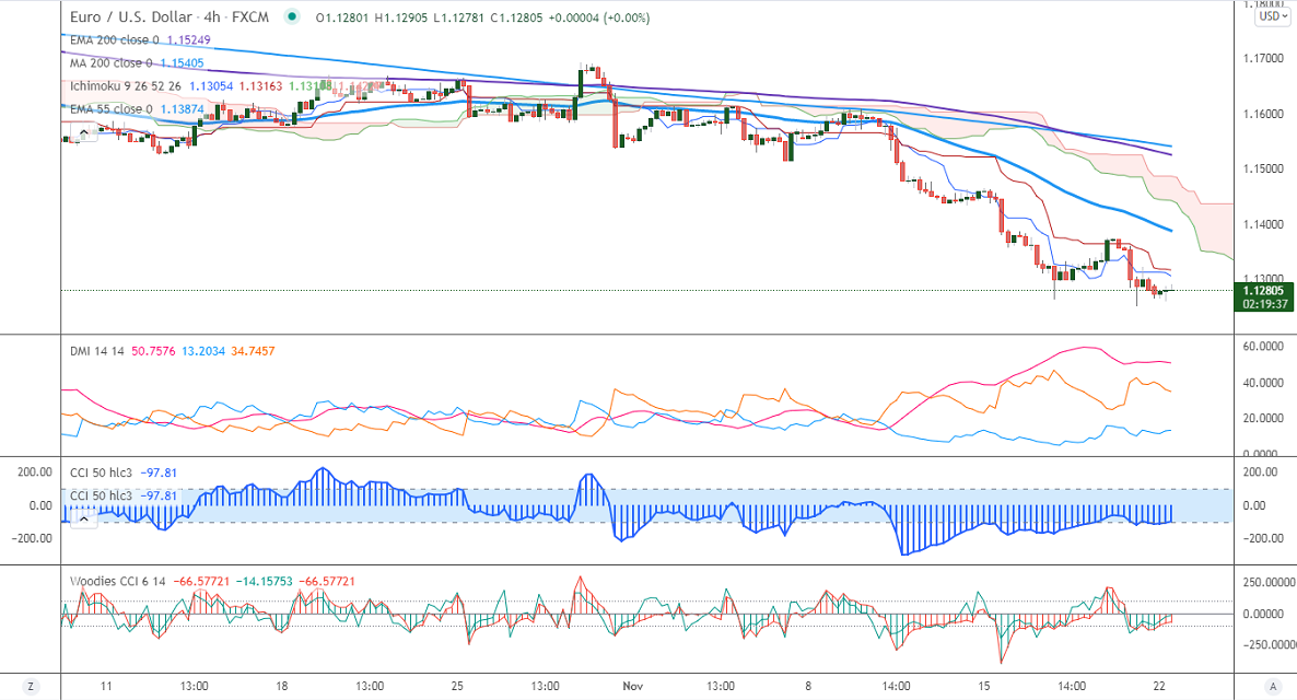 The pair continues to trade weak after a minor pullback till 1.13741. The policy divergence between US Fed and ECB is supporting the US dollar at lower levels. The renewed COVID cases in Europe and lockdown restrictions in Austria are putting pressure on Euro. EURUSD hits an intraday high of 1.12905 and is currently trading around 1.12844.