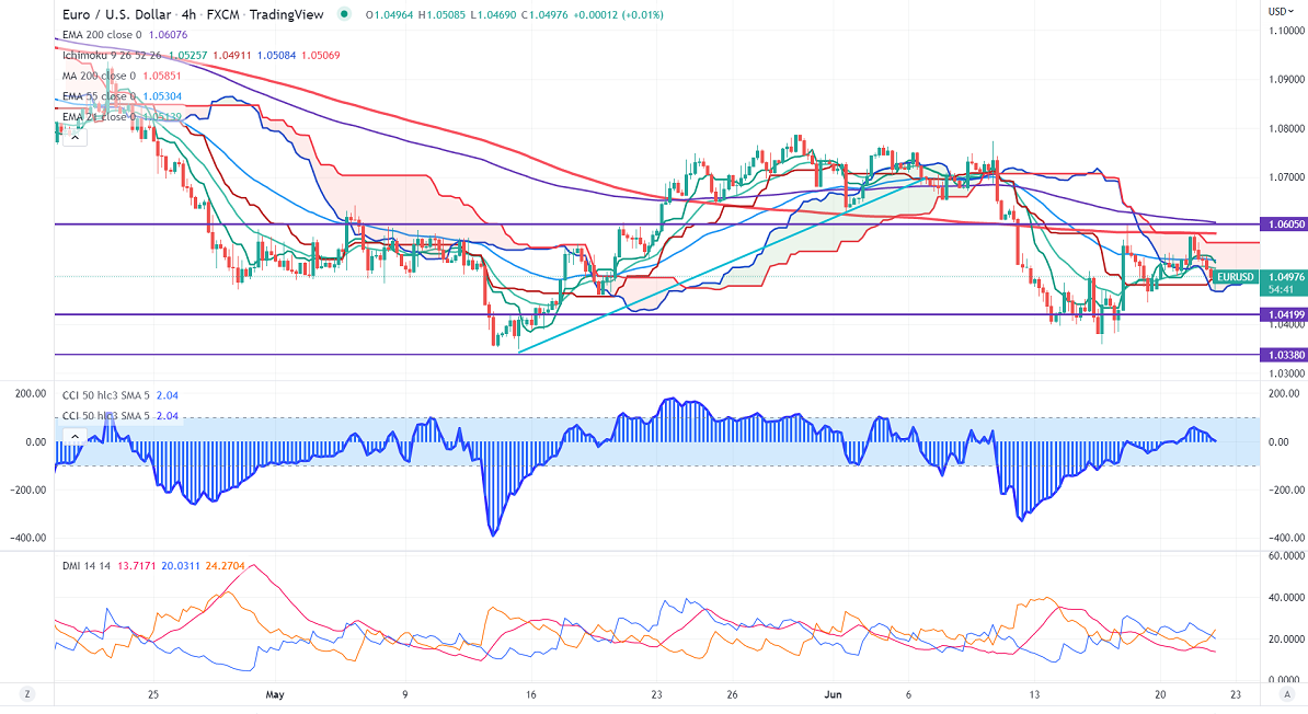 EURUSD pared some of its gains made yesterday on risk aversion. Economic recession fears along with hawkish Fed rate hike supporting safe-haven currencies such as the US dollar. Markets eye US Fed chairman testimony and EU summit for further direction. According to the CME Fed watch tool, the probability of a 75 bpbs rate hike in Jul increased to 96.9% from 88..5% a week ago. EURUSD hits an intraday low of 1.03580 and is currently trading around 1.03973.