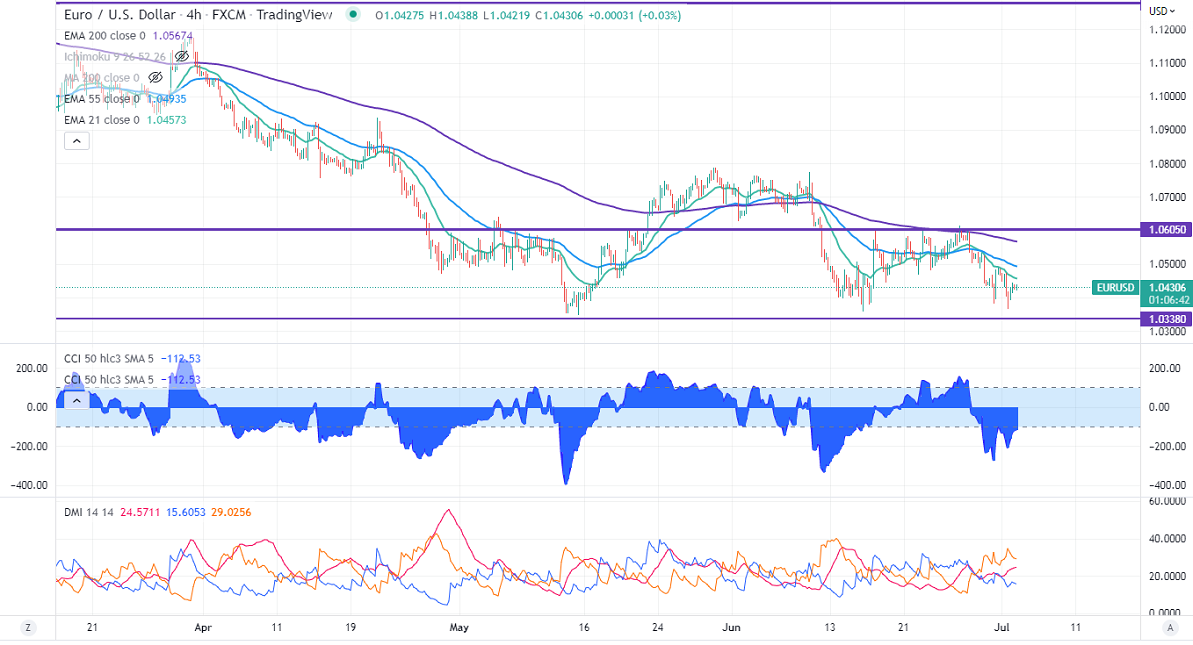 The pair gained after forming a double bottom around 1.03585 levels. The policy divergence between ECB and Fed dragged the EURUSD further down. The US Dollar index pared its gains after weak US ISM manufacturing data. It has dropped to 53.1 in June vs a forecast of 54.90. The decline in US treasury yield for the four consecutive days pushed the pair slightly higher. It made a high of 1.044430 and is currently trading around 1.04315.
