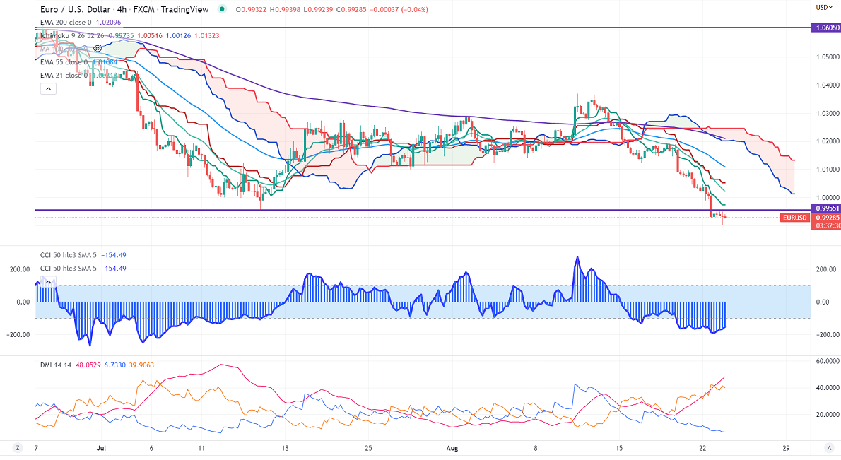 EURUSD declined sharply after breaking a multi-month low of 0.9950 today. The pair showed a minor pullback on upbeat German and EU PMI data. German flash manufacturing PMI Aug came at 49.80 vs 48.20. EU PMI jumped to 49.7 compared to an estimate of 48.9. Markets eye US Fed chairman speech at Jackson Hole symposium for further direction.