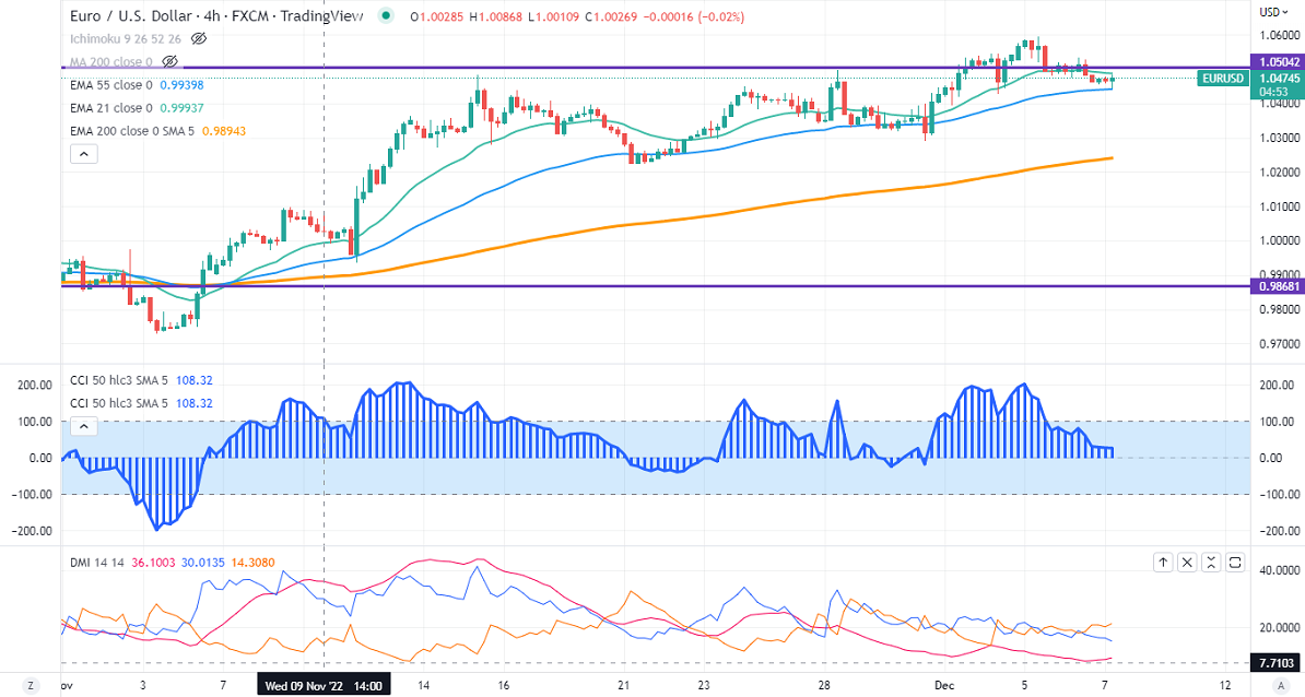 EURUSD consolidated in a narrow range between 1.0480 and 1.05329 for the past two trading days. The chance of an economic recession in the globe supporting the US dollar at lower levels. It hits an intraday low of 1.04431 and is currently trading around 1.04772.