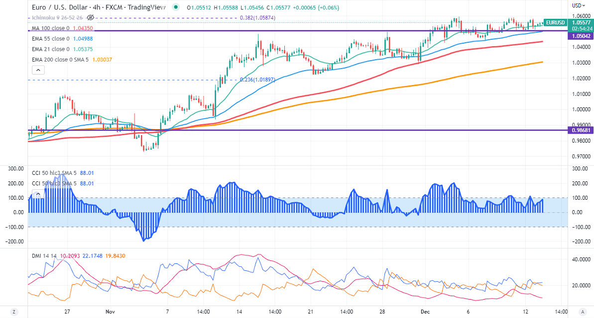 EURUSD consolidating in a narrow range between 1.05882 and 1.05058 for the past three days. Markets await ECB and Fed monetary policy decisions for further direction. The renewed market sentiment after China eases Covid lockdown rules supports Euro at lower levels. It hits an intraday high of 1.05549 and is currently trading around 1.05493.