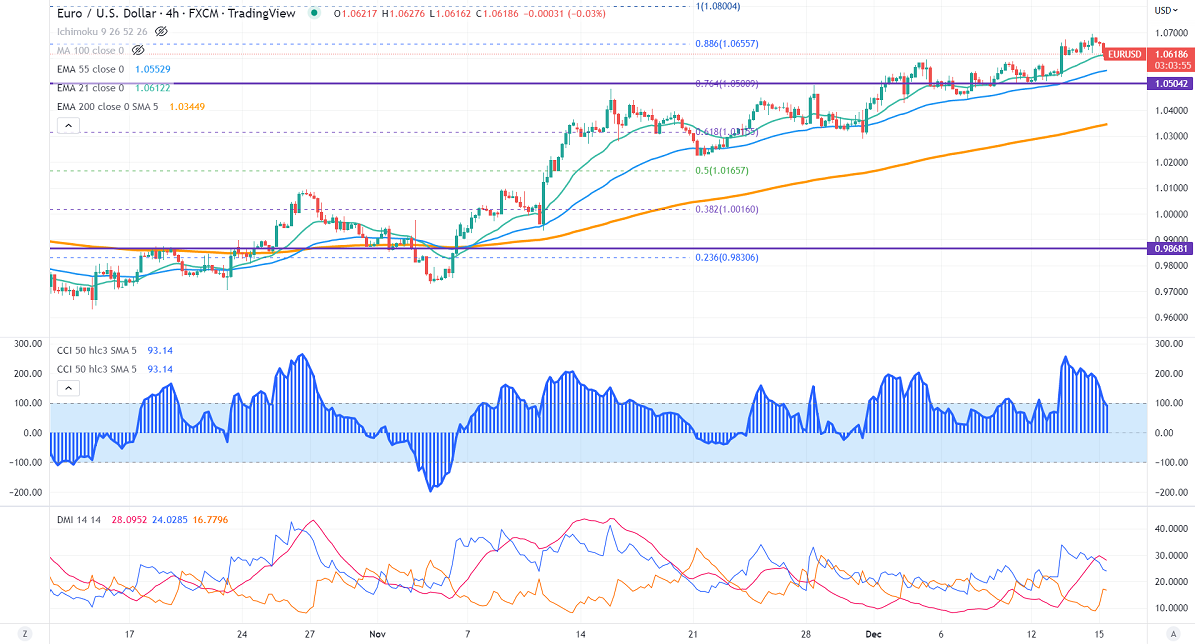 EURUSD pared some of its gains after the hawkish Fed rate hike. The central bank increased 50 bpbs at 4.25% -4.5%, the fourth consecutive increase. The dot plot shows the median rate at end of 2023 at 5.1% vs 4.6% at the September meeting. It hits an intraday low of 1.06056 and is currently trading around 1.06230.