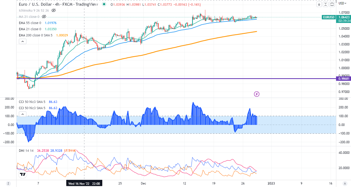 EURUSD consolidating in a narrow range between 1.06695 and 1.05732 for the past five days. The pair failed to make a decisive move ahead of the New Year holiday. Markets eye US Pending home sales and Richmond manufacturing index. It hits an intraday high of 1.06544 and is currently trading around 1.06446.