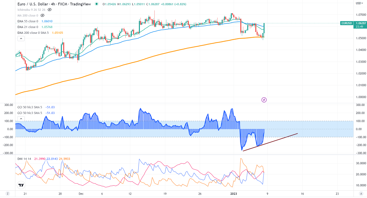 EURUSD pared most of its loss on mixed US Non-farm payroll. The US economy added 223000 jobs in Dec, lower than 256K (revised data for Dec). Unemployment declined to 3.5%, a per-pandemic low. The US dollar index lost its shine and dropped more than 150 pips after jobs data. It hits an intraday high of 1.06238 and is currently trading around 1.06224.