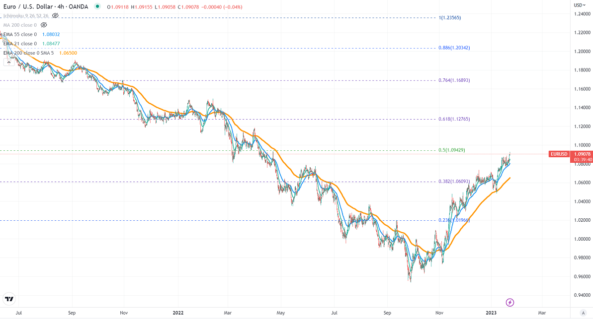 The pair is trading above short-term (21 and 55 EMA) and long-term (200-EMA) in the 4-hour chart. Any break above 1.0950 confirms bullishness, a jump till 1.100/1.0650 likely. The near-term support is around 1.07600. The breach below will drag the pair down to 1.0700/1.0660/1.0600.