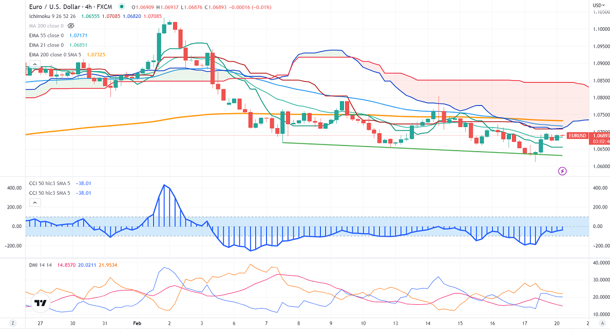 EURUSD recovered nearly 90 pips from Friday's low upbeat market sentiment. The pair was one of the worst performers past three weeks as a surge in inflation, positive US economic data increased the chance of further rate hikes by the Fed. Market eyes FOMC Meeting minutes for further direction. It hits a low of 1.0700 at the time of writing and is currently trading around 1.06937.