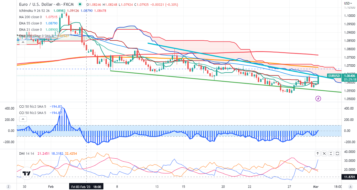The pair is trading below short-term 21 EMA, 55 EMA, and long-term (200-EMA) in the 4-hour chart. Any break below 1.05700 confirms intraday bearishness; a dip to 1.0530/1.0500 is possible. The near-term resistance is around 1.0650. The breach above will push the pair to 1.0700/1.08000/1.08850.