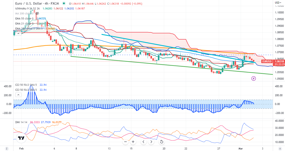 The pair is trading above short-term 21 EMA, 55 EMA, and long-term (200-EMA) in the 4-hour chart. Any break below 1.05700 confirms intraday bearishness; a dip to 1.0530/1.0500 is possible. The near-term resistance is around 1.0700. The breach above will push the pair to 1.08000/1.08850.