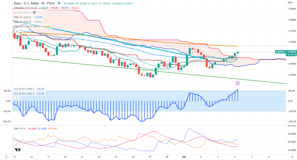 The pair is trading above short-term 21 EMA, 55 EMA, and long-term (200-EMA) in the 4-hour chart. Any break below 1.0600 confirms intraday bearishness; a dip to 1.0570/1.0530/1.0500 is possible. The near-term resistance is around 1.0660. The breach above will push the pair to 1.0700/1.08000/1.08850.