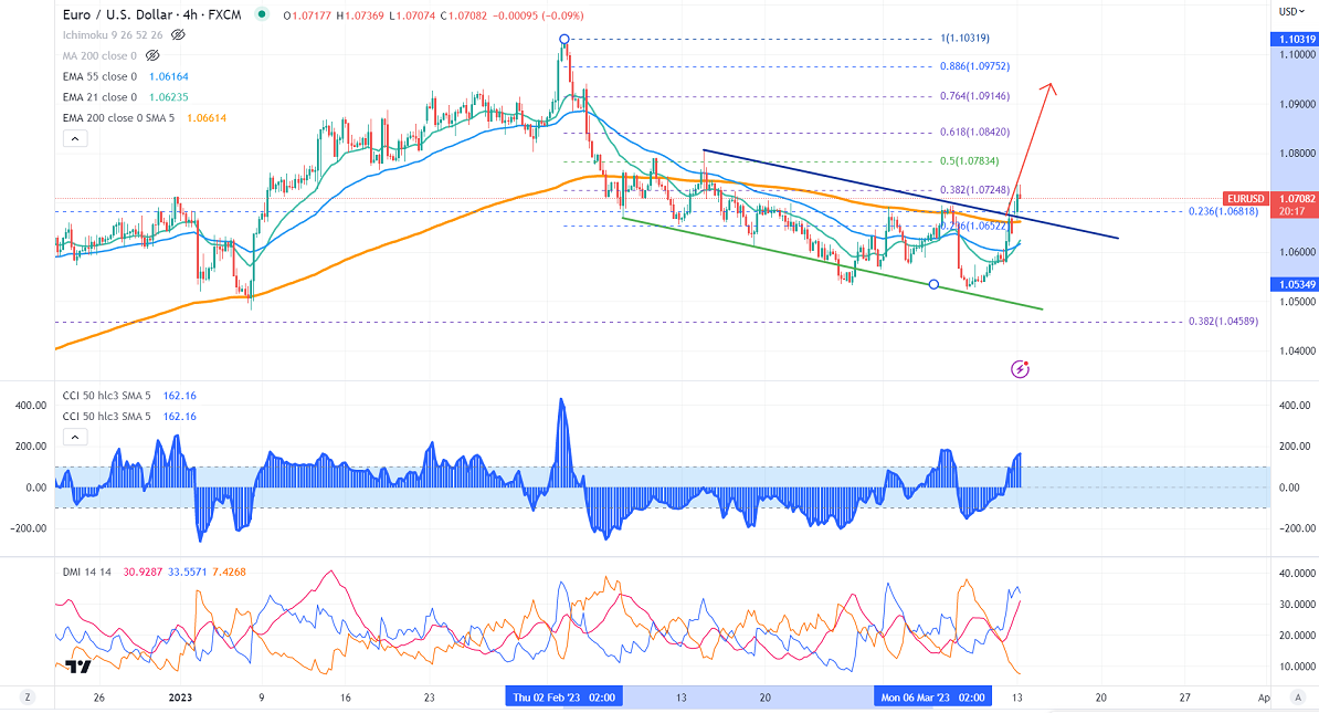 EURUSD showed a nice recovery of more than 130 pips on board-based US dollar selling. The back-to-back collapse of SVB and signature has decreased the chance of further rate hikes by the Fed. The weak US Nonfarm payroll also puts pressure on the US dollar at higher levels.EURUSD hits an intraday high of 1.06065 and is currently trading around 1.05912.