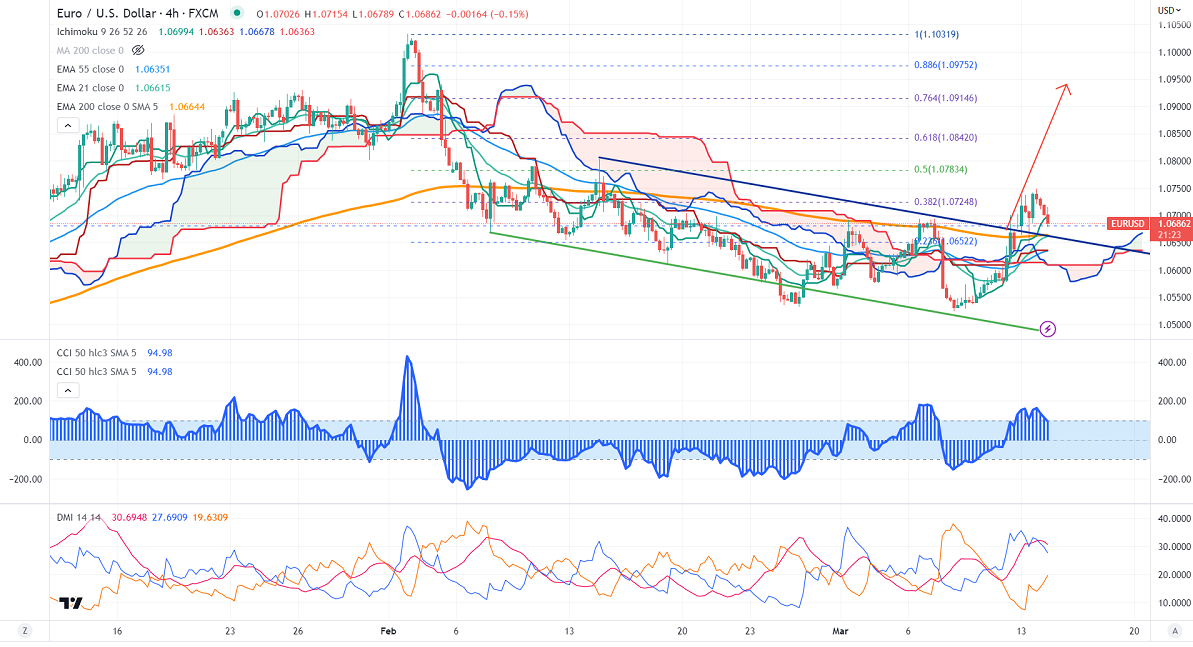 EURUSD trades below 1.0700 ahead of US CPI data. Headline inflation is anticipated to rise by 0.40% m/m from 0.50% the previous month. The yearly CPI was expected 6% vs . 6.40% the previous month. The collapse of Silicon valley bank and Signature bank has decreased the chance of a rate hike by the Fed. It hits an intraday high of 1.07485 and is currently trading around 1.06958.