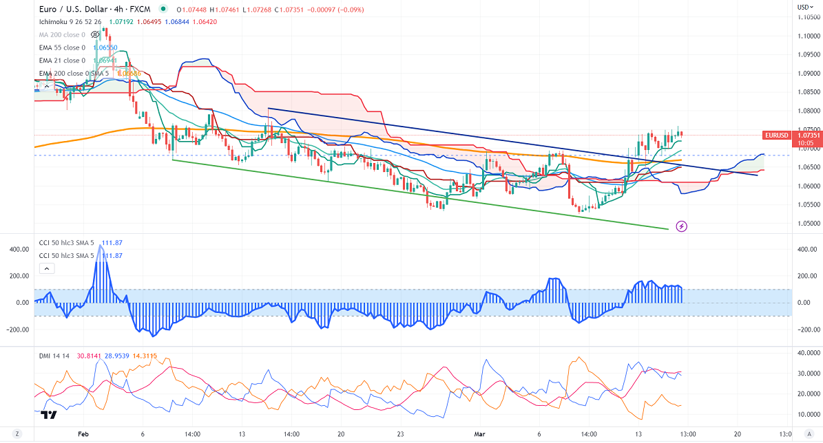 EURUSD showed a minor sell-off and trades below 1.0750. US CPI rose 0.40% last month in line with the estimate, below 0.50% the previous month. The yearly CPI declined to 6% in Feb, the smallest annual gain since Sep 2021. It hits an intraday high of 1.07599 and is currently trading around 1.07366.