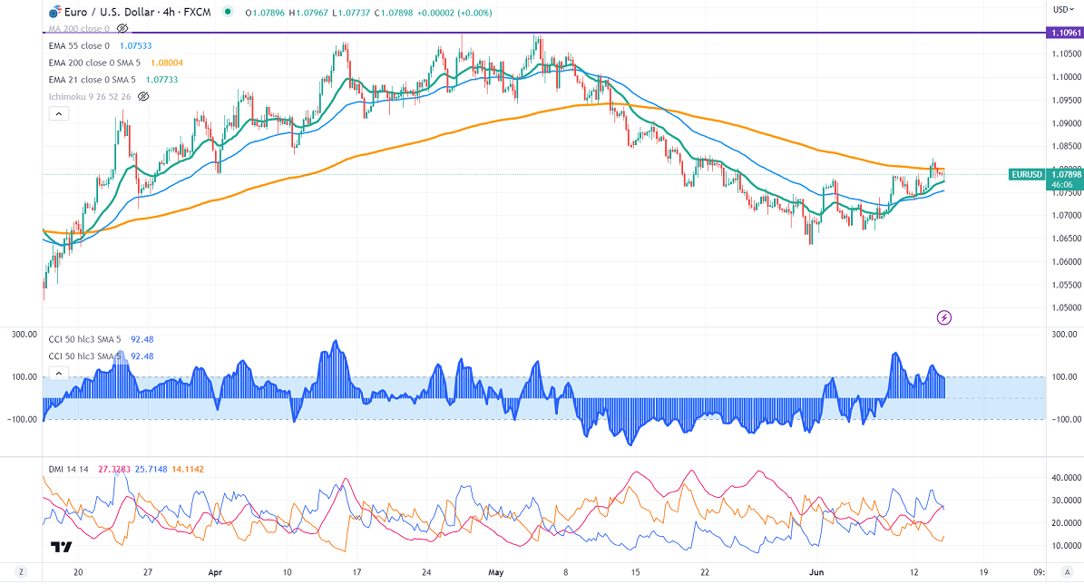 EURUSD declined below 1.0800 ahead of US Fed monetary policy.US core CPI rose 4% in May from 4.9% in Apr, the lowest level since Mar 2021 in Apr. US May inflation rate at 0.10% (MoM) Vs Est 0.30%. It hits an intraday low of 1.07730 and is currently trading around 1.07877.