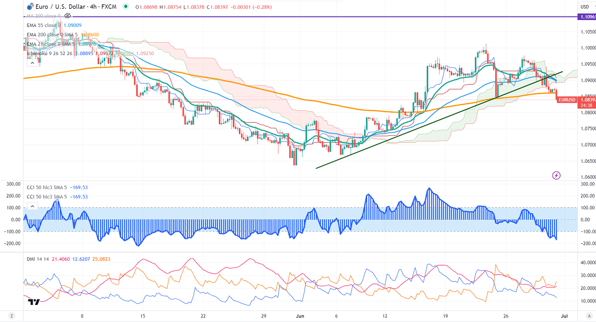 The pair trades below short-term 21 EMA, 55 EMA, and long-term (200-EMA) in the 4-hour chart. Any indicative break below 1.08500 confirms intraday bearishness; a decline to 1.080/1.0760 is possible. The near-term resistance is around 1.0900. The breach above targets 1.0950/1.100.