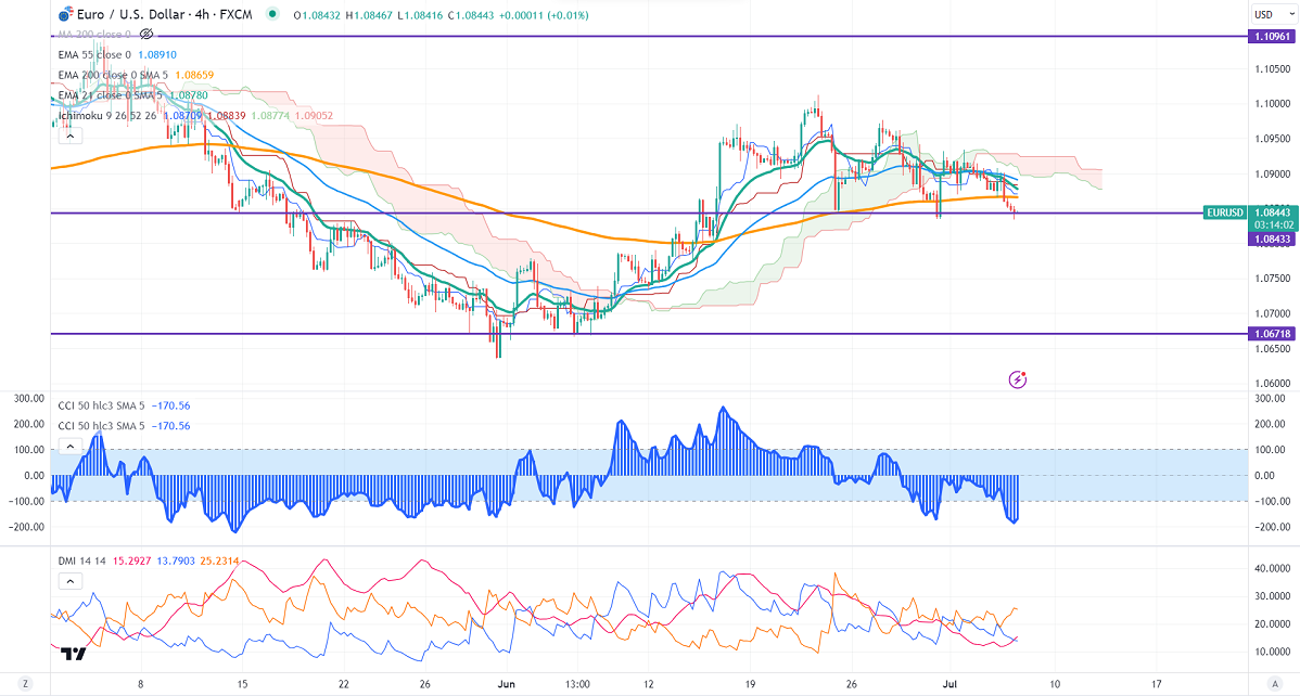 The pair trades below short-term 21 EMA, 55 EMA, and long-term (200-EMA) in the 4-hour chart. Any indicative break above 1.0880 confirms intraday bullishness; a jump to 1.0950/1.1000/1.1100 is possible. The near-term support is around 1.0830. The breach below targets 1.0800/1.0760.