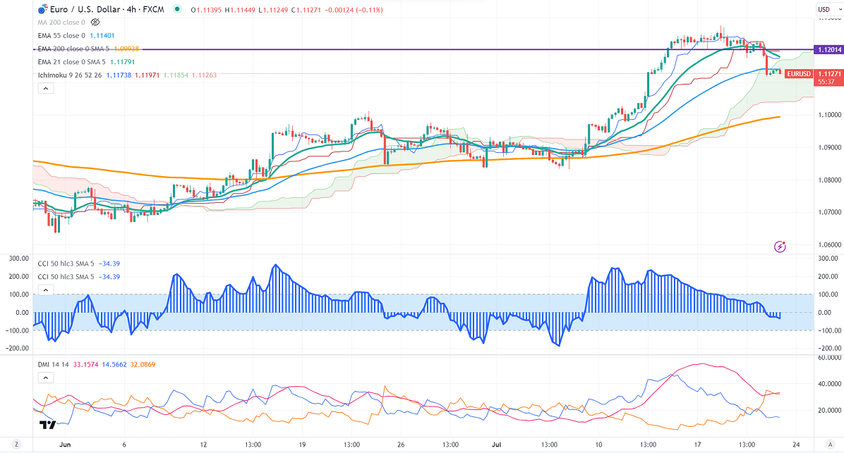 The pair trades below short-term 21 EMA, 55 EMA, and above long-term (200-EMA) in the 4-hour chart. Any indicative break below 1.1100 confirms intraday bearishness; a decline to 1.1000/1.0950 is possible. The near-term resistance is around 1.1150. The breach above targets 1.1200/1.1275.
