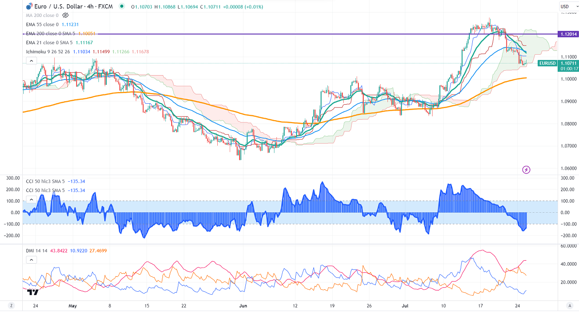 The pair trades below short-term 21 EMA, 55 EMA, and above long-term (200-EMA) in the 4-hour chart. Any indicative break below 1.1050 confirms intraday bearishness; a decline to 1.1000/1.0950 is possible. The near-term resistance is around 1.1150. The breach above targets 1.1200/1.1275.