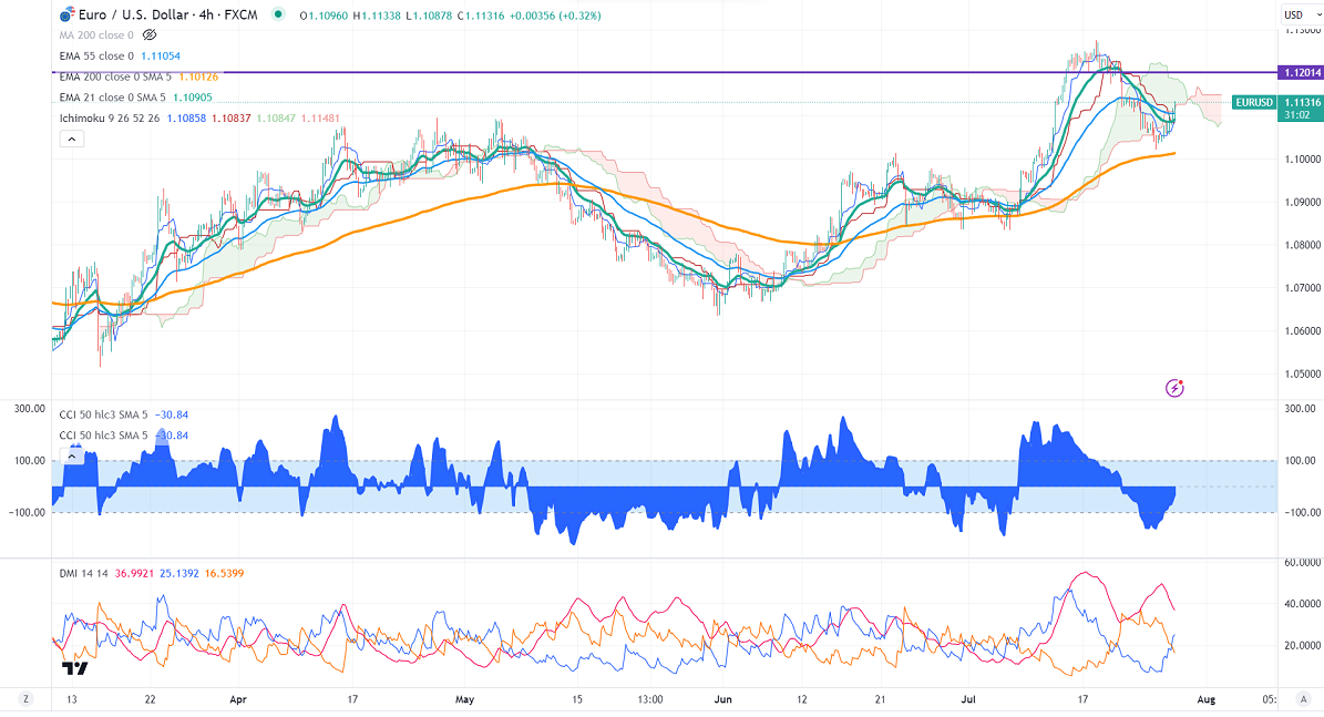 The pair trades above short-term 21 EMA, 55 EMA, and long-term (200-EMA) in the 4-hour chart. Any indicative break above 1.11500 confirms intraday bullishness; a jump to 1.1180/1.1250/1.1300 is possible. The near-term support is around 1.1080. The breach below targets 1.1050/1.1000.