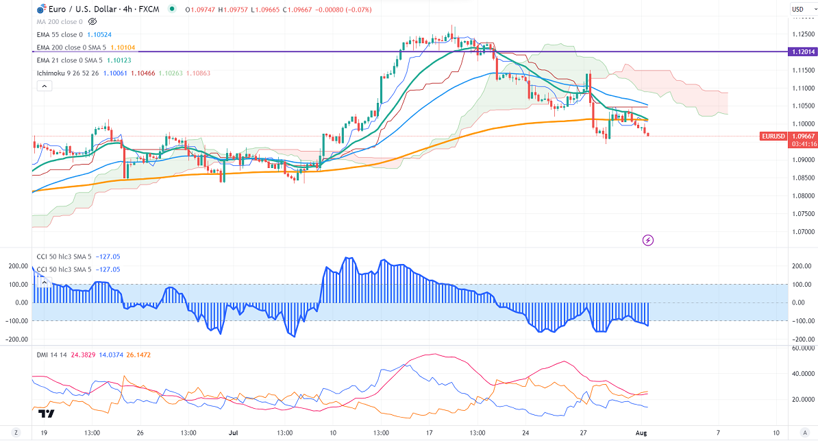 EURUSD showed a minor sell-off despite a positive Euro PMI. Eurozone final PMI came at 4.27 in Jul, in line with the estimate. German Final manufacturing PMI dropped to 38.8 in Jul from the previous month's 40.60. It hits a low of 1.09683 and is currently trading around 1.09682.