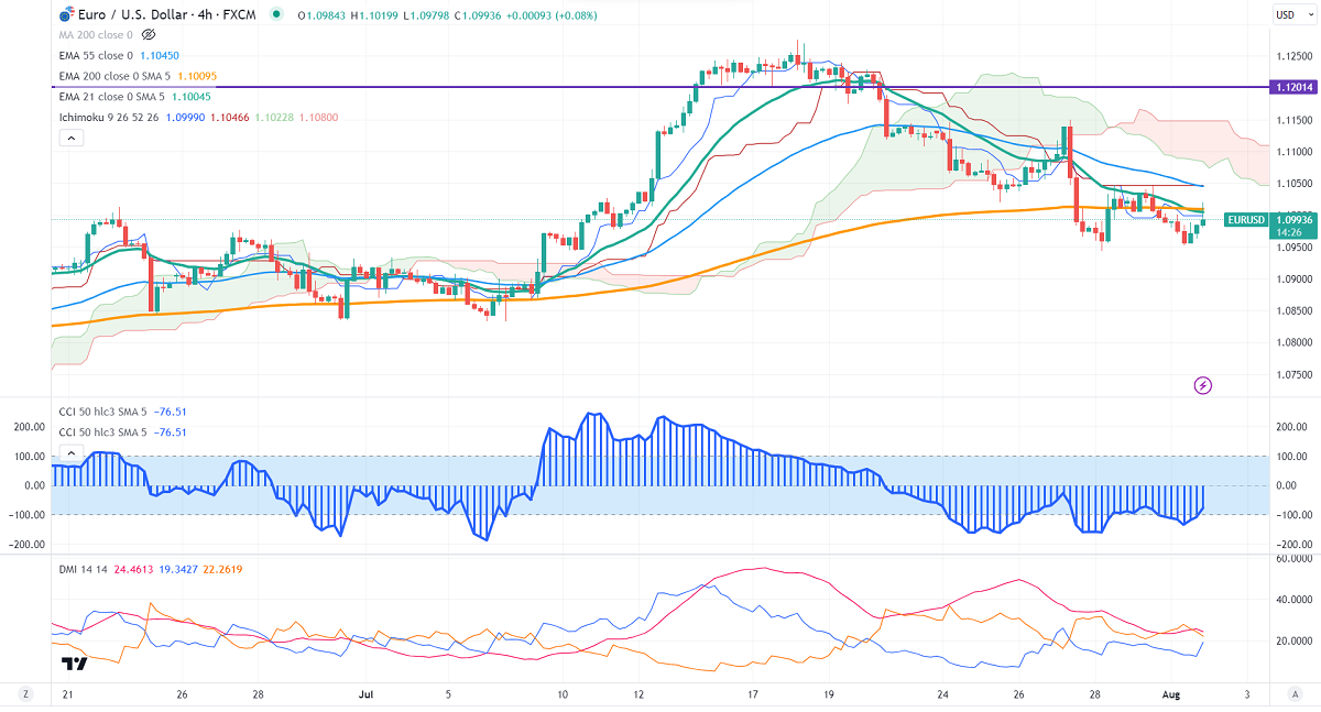 The pair trades below short-term 21 EMA, 55 EMA, and long-term (200-EMA) in the 4-hour chart. Any indicative break below 1.0950 confirms further bearishness: a decline to 1.0900/1.0850 is possible. The near-term resistance is around 1.1050. The breach above targets 1.1150/1.1180.