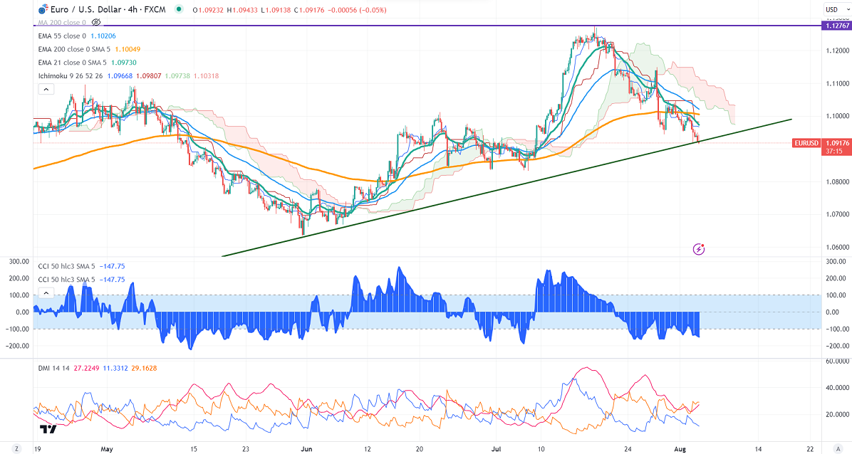 The pair trades below short-term 21 EMA, 55 EMA, and long-term (200-EMA) in the 4-hour chart. Any indicative break below 1.0900 confirms further bearishness: a decline to 1.0850/1.0800 is possible. The near-term resistance is around 1.0950. The breach above targets 1.100/1.1050.