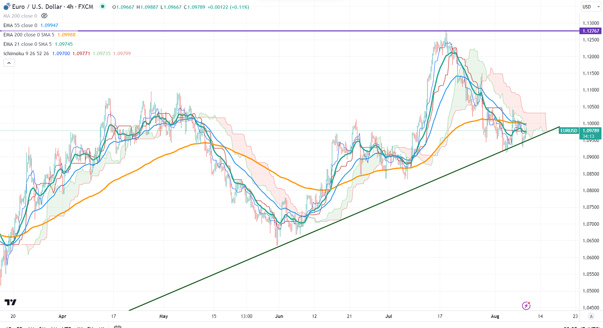 The pair trades below short-term 21 EMA, above 55 EMA, and long-term (200-EMA) in the 4-hour chart. Any indicative break below 1.0900 confirms further bearishness: a decline to 1.0830/1.0760 is possible. The near-term resistance is around 1.100. The breach above targets 1.1050/1.1100.