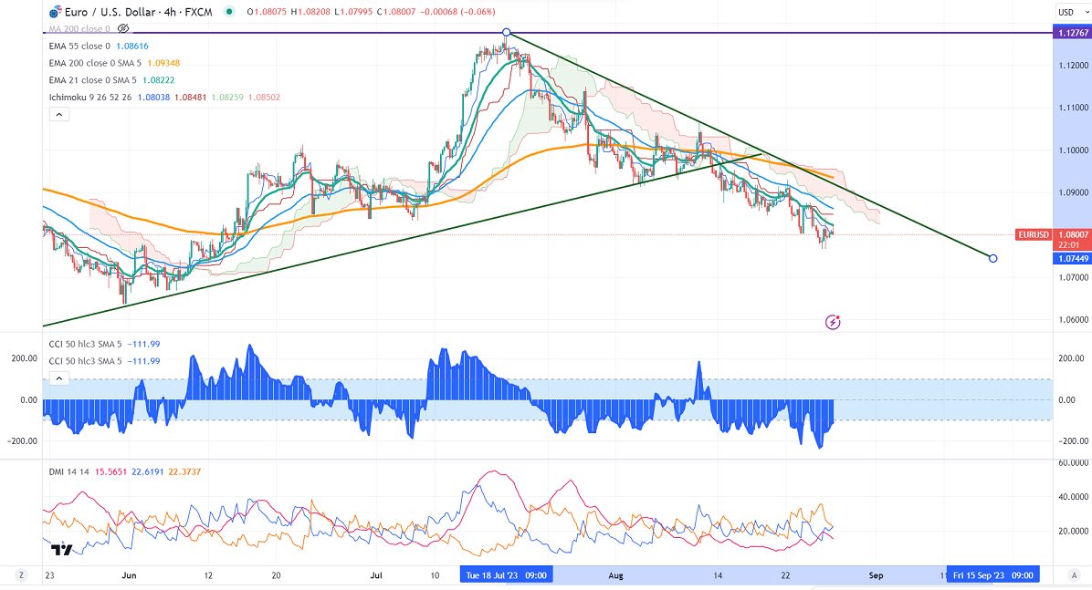 The pair trades below short-term 21 EMA, 55 EMA, and long-term (200-EMA) in the 4-hour chart. Any indicative break below 1.0760 confirms further bearishness: a decline to 1.0700/1.0660 is possible. The near-term resistance is around 1.0850. The breach above targets 1.0935/1.0965/1.1000.