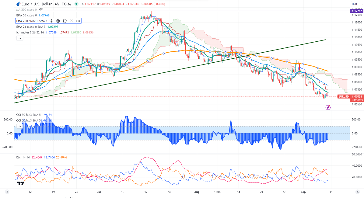 The pair trades below short-term 21 EMA, 55 EMA, and long-term (200-EMA) in the weekly chart. Any break below 1.0660 confirms further bearishness. A decline to 1.0600/1.0500 is possible. The near-term resistance is around 1.0760, any breach above targets is 1.0800/1.0880.