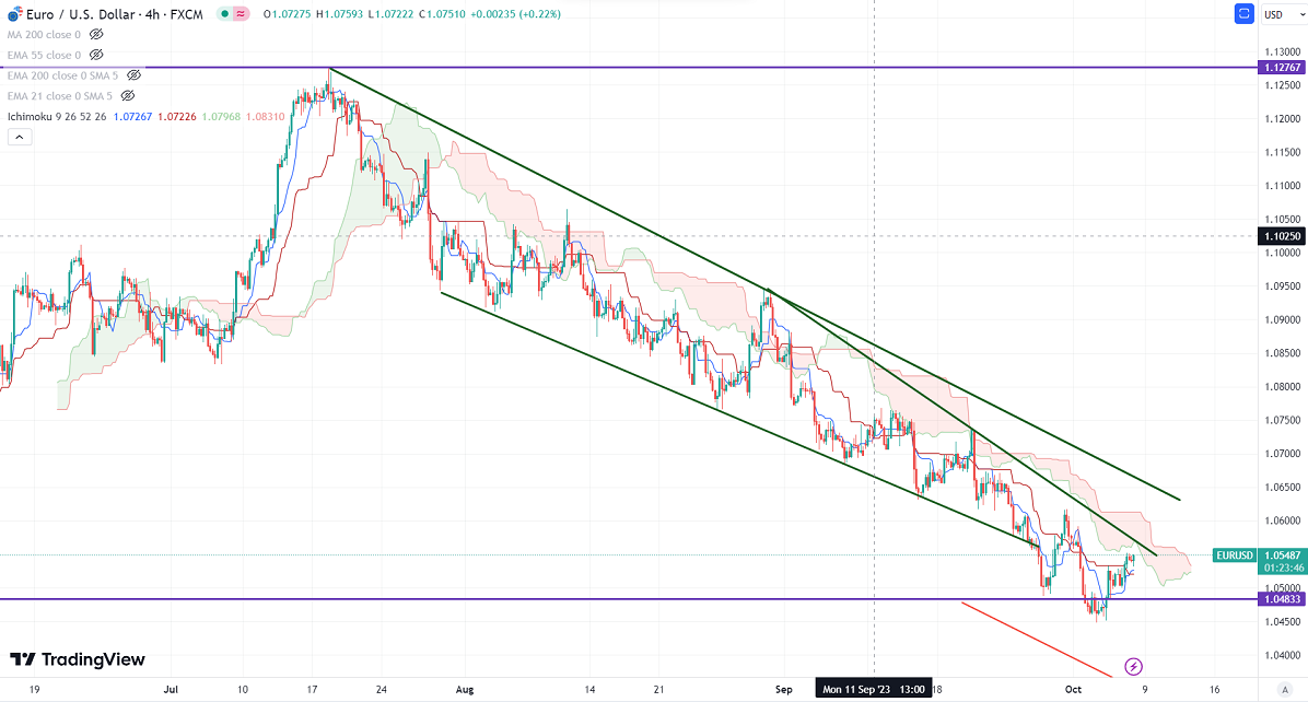 EURUSD showed a minor pullback ahead of US NFP data. It hit a high of 1.05513 yesterday and is currently trading around 1.05441. The US economy is expected to have added 171000 jobs in Sep from the previous month 187000. The unemployment rate is likely to decline to 3.7% from 3.8%.