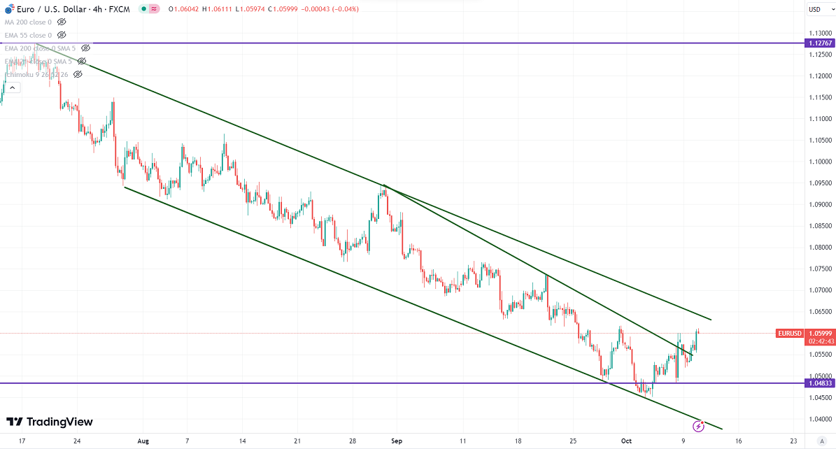 EURUSD trades in a narrow range after a massive jump of more than 100 pips. It hit a low of 1.04482 the previous week and is currently trading around 1.05656.