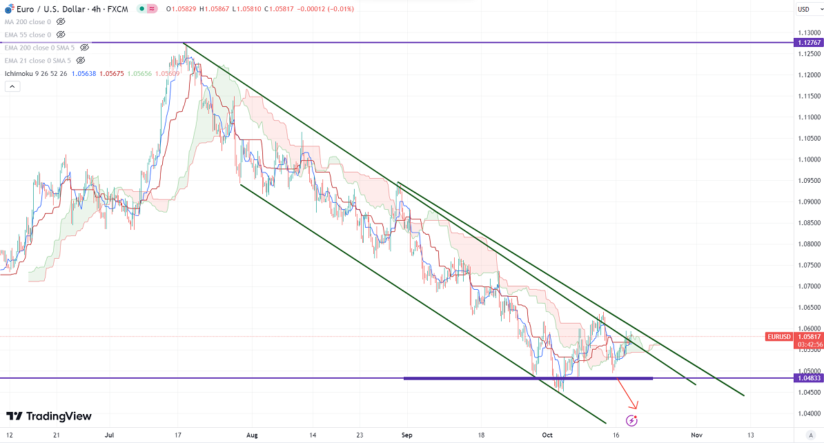 The pair trades above short-term 21 EMA, 55 EMA, and below long-term (200-EMA) in the 4-hour chart. Any break below 1.04800 confirms further bearishness. A dip to 1.0440/1.0380/1.0325 is possible. The near-term resistance is around 1.0660, and any breach above targets 1.0700/1.07650/1.0800. Bullish invalidation only if it breaks below 1.0440.