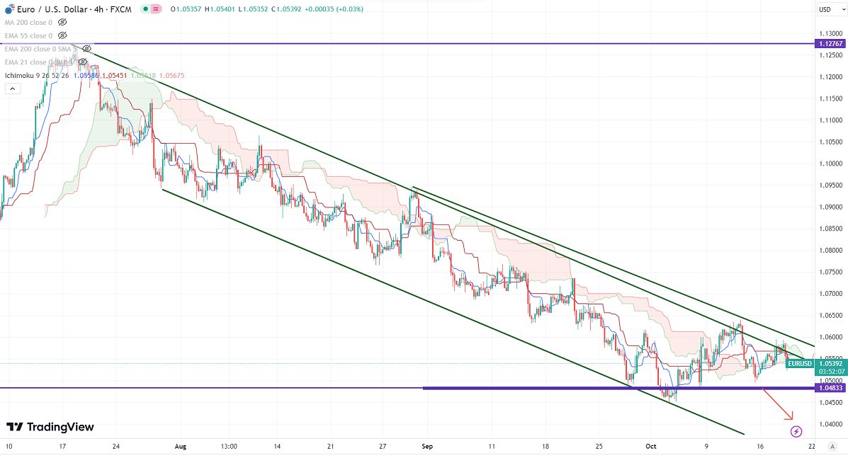 The pair trades above short-term 21 EMA, 55 EMA, and below long-term (200-EMA) in the 4-hour chart. Any break below 1.04800 confirms further bearishness. A dip to 1.0440/1.0380/1.0325 is possible. The near-term resistance is around 1.0660, and any breach above targets 1.0700/1.07650/1.0800. Bullish invalidation only if it breaks below 1.0440.