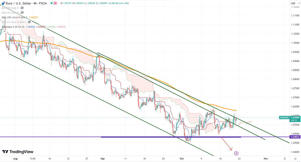 The pair trades above short-term 21 EMA, 55 EMA, and below long-term (200-EMA) in the 4-hour chart. Any break below 1.04800 confirms further bearishness. A dip to 1.0440/1.0380/1.0325 is possible. The near-term resistance is around 1.0660, and any breach above targets 1.0700/1.07650/1.0800. Bullish invalidation only if it breaks below 1.0440.