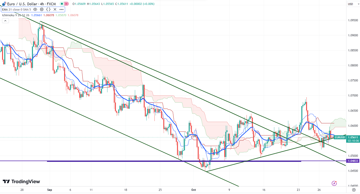 EURUSD trading flat ahead of German GDP and CPI data for further direction. It hit a low of 1.05565 at the time of writing and is currently trading around 1.05603.