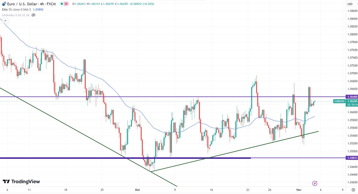 EURUSD holds above 1.0600 ahead of the US Nonfarm payroll. It hit a high of 1.06675 yesterday and is currently trading around 1.06302.