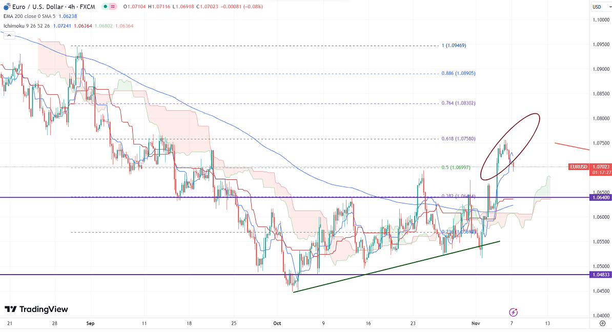 EURUSD halted its two-day winning streak and showed a minor sell-off. It hit a high of 07562 yesterday and is currently trading around 1.06991.