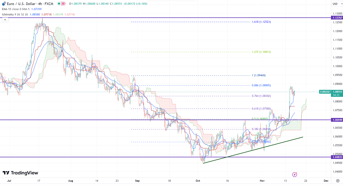 The pair trades above short-term 21 EMA, 55 EMA, and long-term (200-EMA) in the 4-hour chart. Any break above 1.0900 confirms further bullishness. A jump to 1.0948/1.1000 is possible. The near-term support is around 1.08300 and any breach below targets is 1.0765/1.0700. Bullish invalidation only if it breaks below 1.0440.