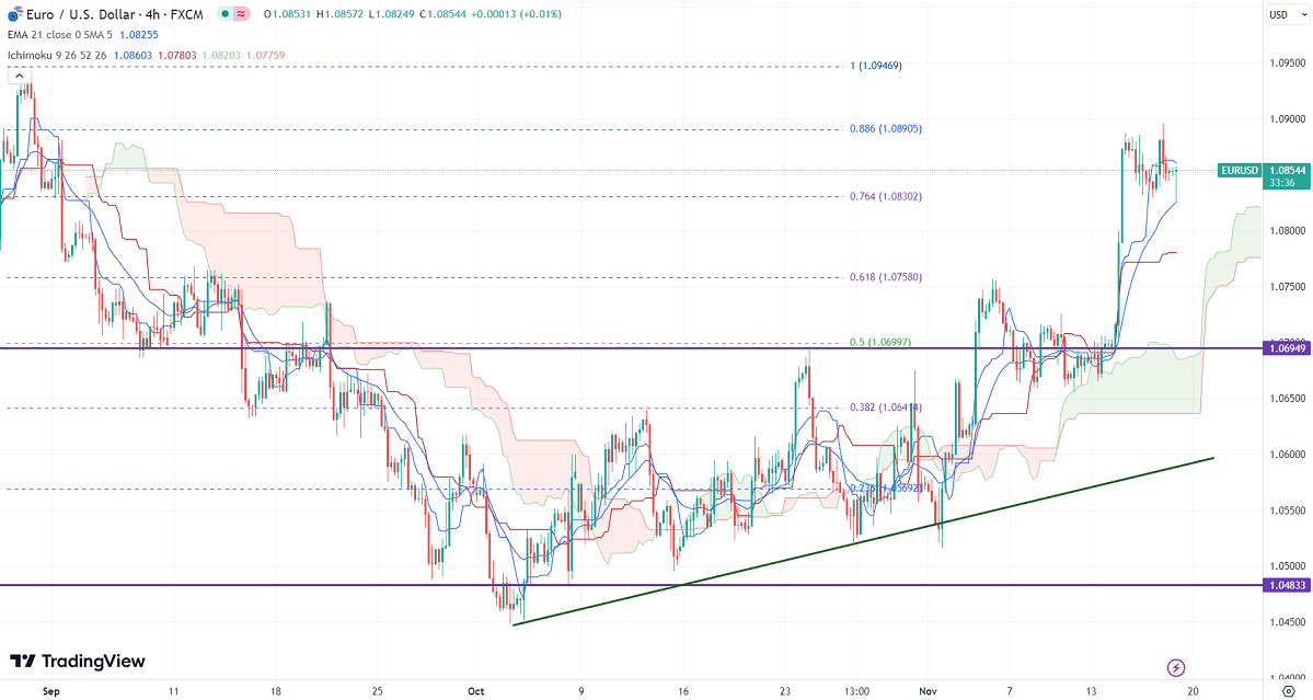 The pair trades above short-term 21 EMA, 55 EMA, and long-term (200-EMA) in the 4-hour chart. Any break above 1.0900 confirms further bullishness. A jump to 1.0948/1.1000 is possible. The near-term support is around 1.08300, any breach below targets is 1.0765/1.0700. Bullish invalidation only if it breaks below 1.0440.