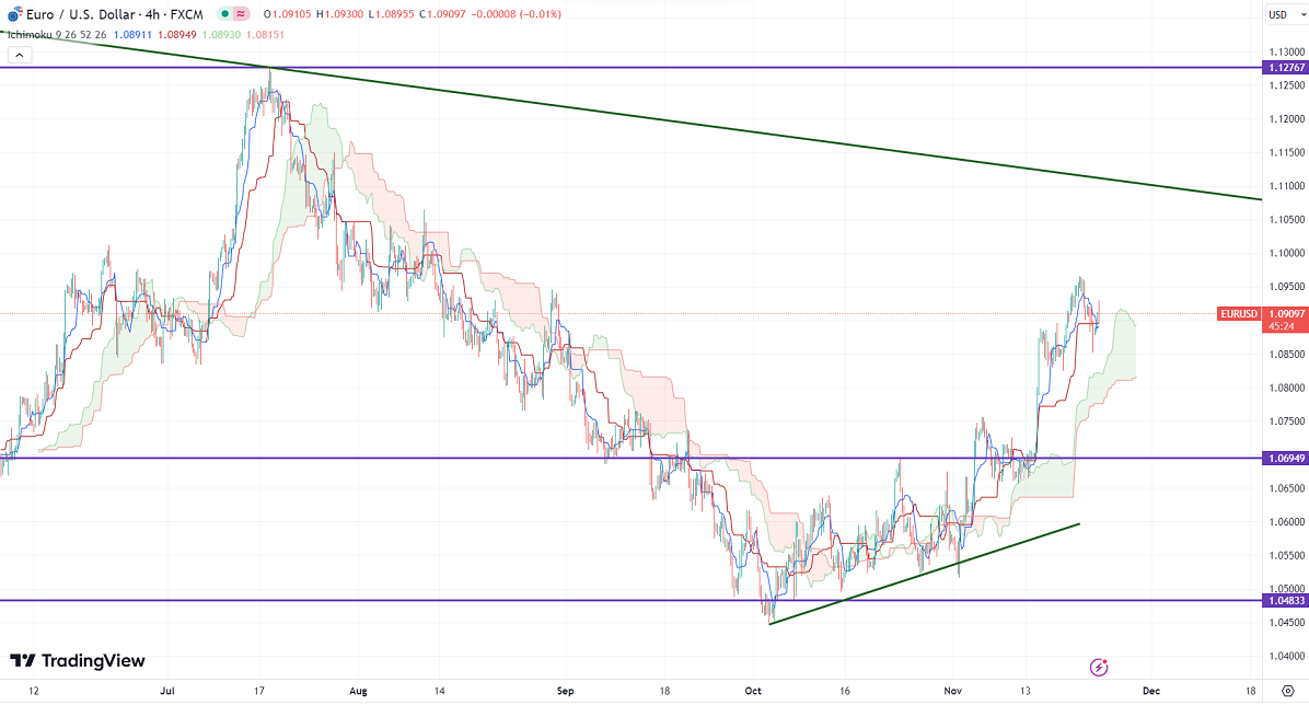 The pair trades above short-term 21 EMA, above 55 EMA, and long-term (200-EMA) in the 4-hour chart. Any break above 1.100 confirms further bullishness. A jump to 1.1070/1.1100 is possible. The near-term support is around 1.0860 and any breach below targets is 1.0835/1.0800/1.0760. Bullish invalidation only if it breaks below 1.0440.