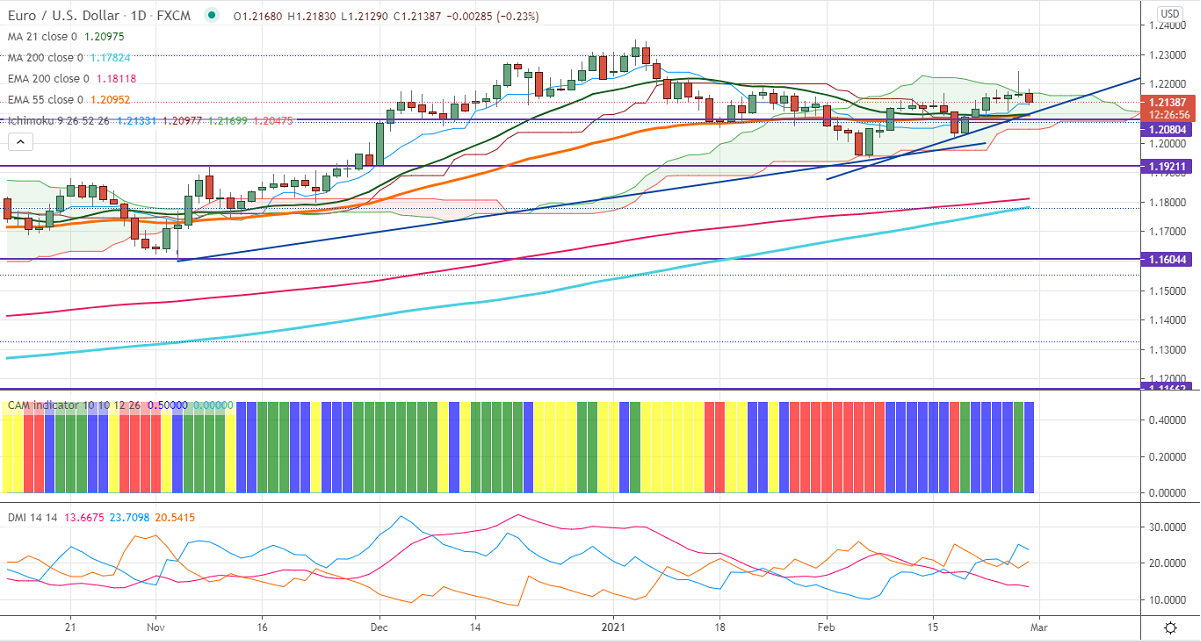 EURUSD lost more than 80 pips from minor top 1.2247 on broad-based US dollar buying. The surge in US 10- year yield is supporting the US dollar at lower levels. The yield hits fresh year 1.56% on hopes of massive fiscal stimulus in the U.S to counter Coronavirus. US Q4 GDP surged to 4.1% compared to a forecast of 4.2%. The number of people who have filed for unemployment benefits declined to 730k in the week ended Feb 20th vs an estimate of 828k. EURUSD hits an Intraday low of 1.21290 and is currently trading around 1.21377.