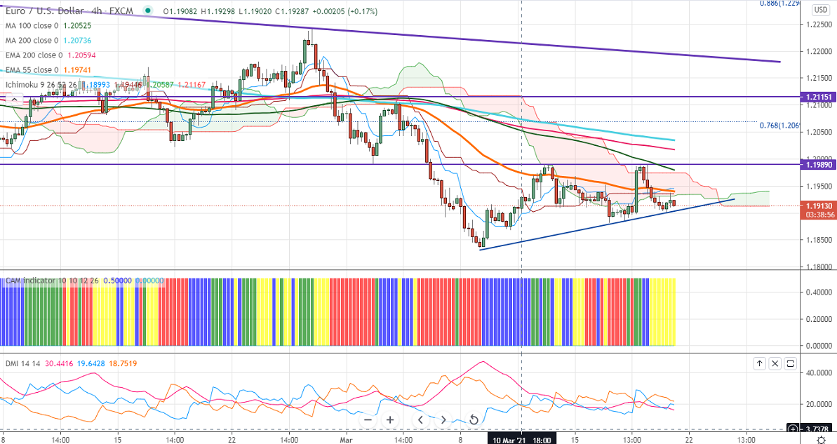 EURUSD has taken support near the trend line and shown a minor recovery. The minor profit booking in US bond yield is supporting the pair at lower levels. The US 10- year yield lost more than 4.5% after hitting 13—year high. The number of people who have filed for unemployment benefits rose to 77000 during the week ended Mar 13th. The Philly fed manufacturing index soared to 51.80 in Mar, the highest level in 50 years.
