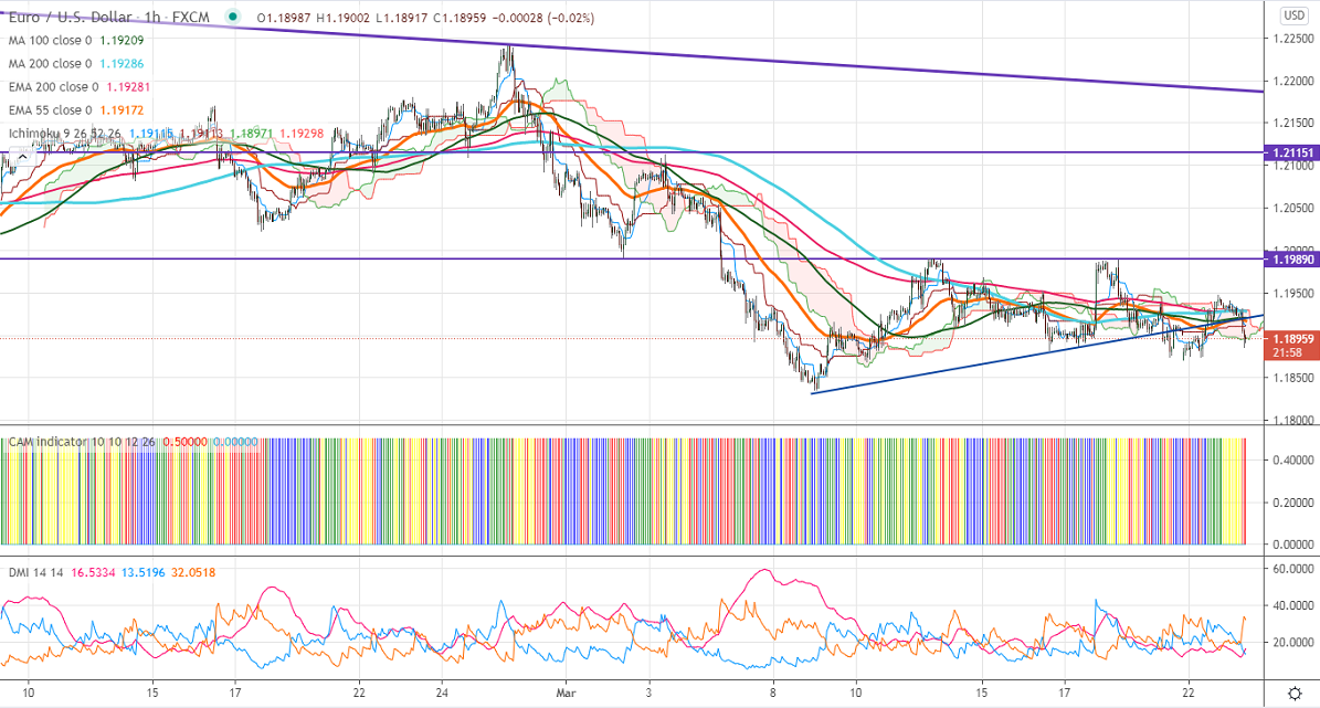 EURUSD has once again declined after a minor jump till 1.19458. The extension of lockdown in Germany till Apr 18th and spread of British variant corona in Germany is putting pressure on Euro at higher levels. The slight profit booking in the US 10-year bond yield after hitting a multi-year high of 1.744% is preventing the pair from major sell-off. Market eyes US Fed chairman Powell's testimony on the quarterly CARES act before the House of Financial Services Committee for further direction.