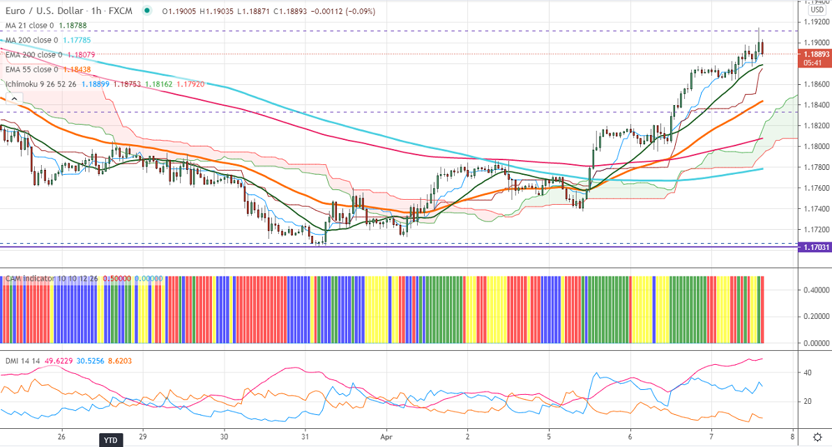 EURUSD is trading higher for 3rd consecutive days and surged more than 150 pips on broad-based US dollar selling. The European positive vaccine rollout and upbeat services PMI is supporting Euro at lower levels. Markit German services PMI for Mar came at 51.5 compared to a forecast of 50.8. Markets eye US Fed FOMC meeting minutes and Biden infrastructure plan for further direction. The sell-off in US 10-year yield is also putting pressure on the US dollar.