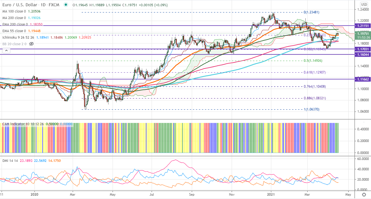 EURUSD is consolidating after hitting a high of 1.19932 yesterday. The shortage of Coronavirus vaccine in Europe and geopolitical tensions between the US and Russia are supporting the US dollar at lower levels. US retail sales data surged to 9.8% in Mar compared to a forecast of 5.8%. The number of people who have filed for unemployment benefits declined to 576k in the previous week compared to an estimate of 703K. US 10- year yield lost more than 9.% this week and is hovering near 1.58%