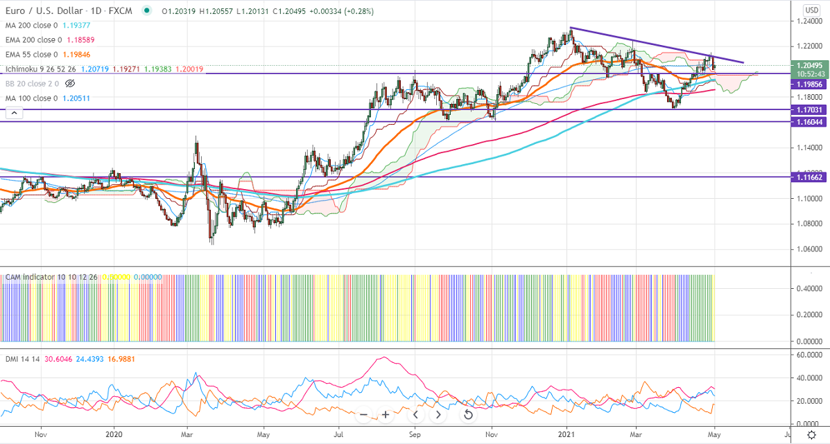 EURUSD has declined sharply after four weeks of the bullish trend. The pair gained more than 3.5% from a low of 1.17100 on broad-based US dollar selling. The pair hit a high of 1.21500 and lost nearly 150 pips on upbeat US economic data. US personal income jumped to 21.1% compared to a forecast of 20.1%. The personal consumption expenditure rose 0.4% in Mar vs forecast of 0.3%. DXY upside capped by 100-4H MA. Any convincing break above that level confirms intraday bullishness. EURUSD hits an intraday low of 1.20131 and is currently trading around 1.20491.
