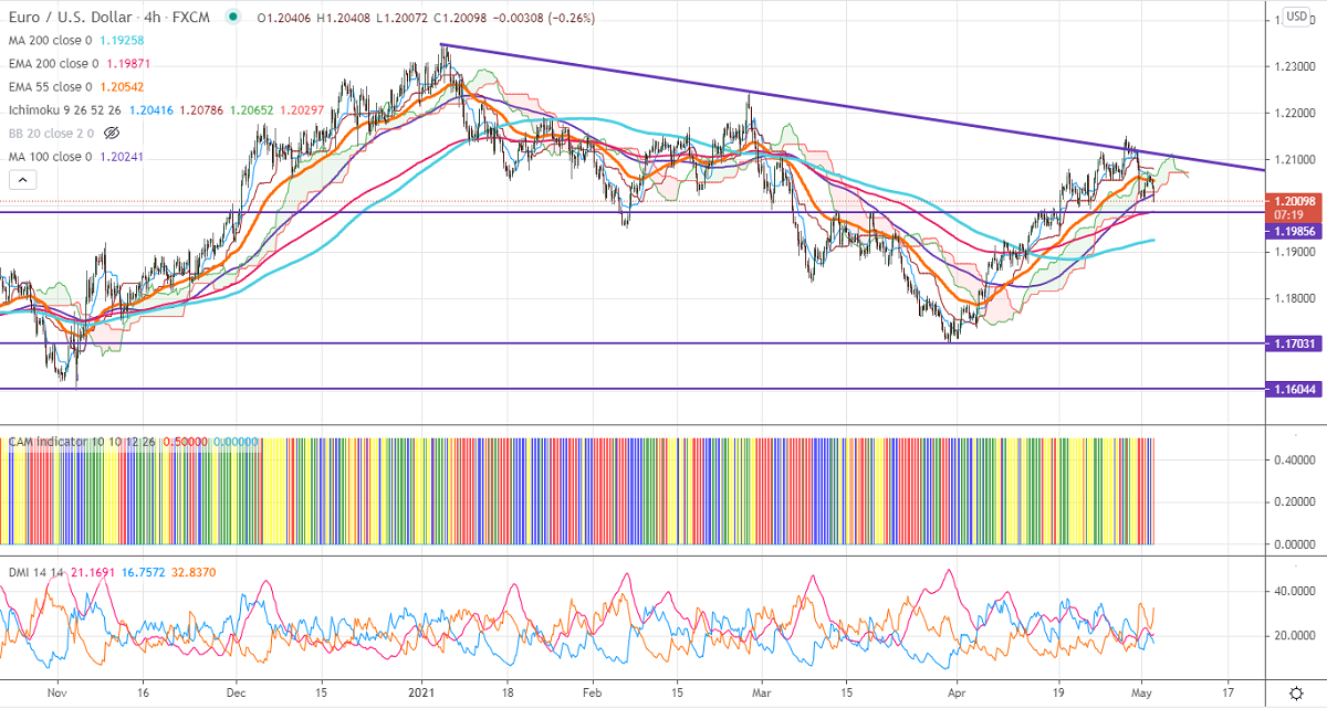 EURUSD has declined sharply after a minor pullback till 1.20758 on broad-based US dollar buying. The Fed chairman Powell said that the economic outlook is "clearly brightened" but recovery is uneven in the low-income group. The pair hits an intraday low of 1.20072. It is currently trading around 1.20206. The US ISM manufacturing index came at 60.7 for Apr slightly lowered compared to the forecast of 65%.DXY upside capped by 200-4H MA. Any convincing break above 91.50 confirms a minor bullish continuation. A jump to 91.90 likely.