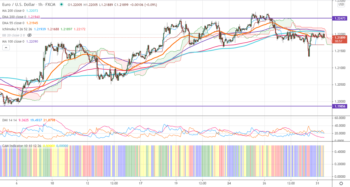 EURUSD recovered from a low of 1.21328 despite strong US data. US core PCE surged to 3.1% y/y vs forecast of 2.9%. The monthly core Personal consumption came at 0.7% slightly above the estimate of 0.6%. The US 10- year yield declined more than 2.5% after hitting a high of 1.323% on Friday. DXY is holding slightly above 90 levels; any breach above 90.50 confirms intraday bullishness. EURUSD hits an intraday low of 1.22029 and is currently trading around 1.21931.