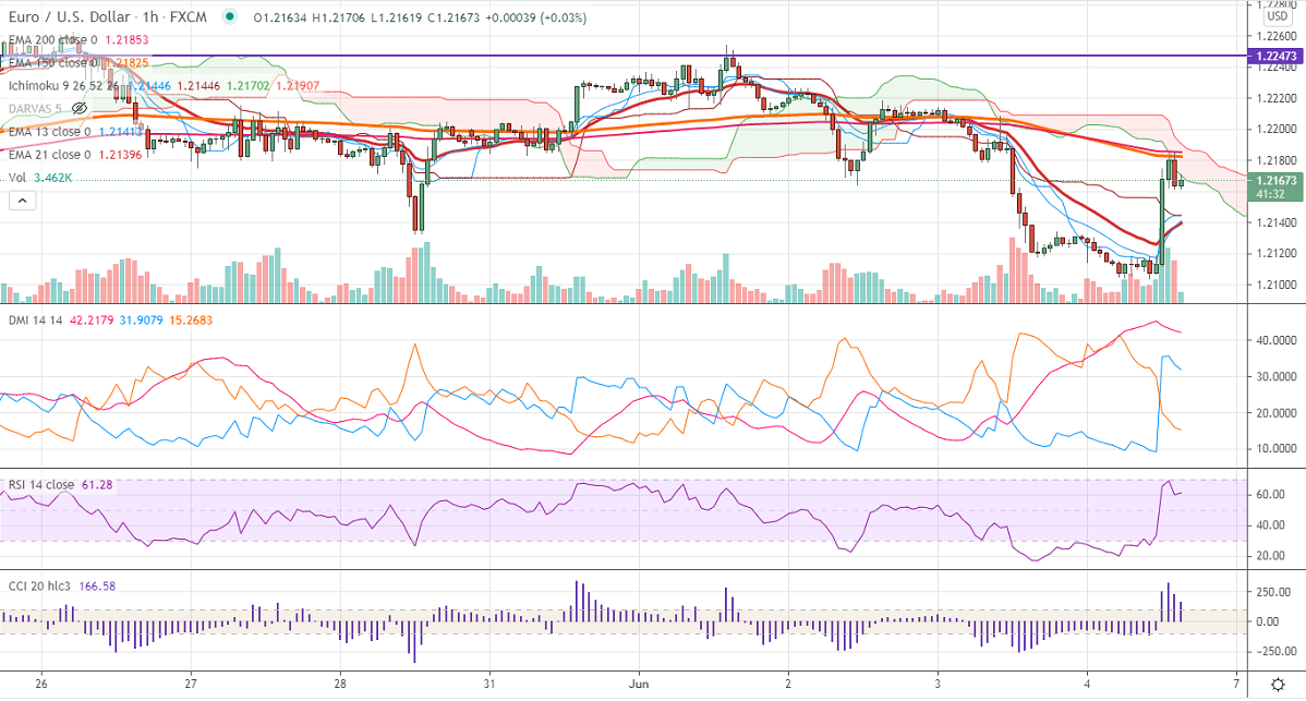 EURUSD gained sharply above 1.2150 levels after weak US Nonfarm payrolls data. US economy has added 559000 jobs in May much less forecast of 645K. The unemployment rate declined to 5.8% from the previous month to 6.1%. DXY lost more than 50 pips after the data. Any breach below 90 confirms further weakness. The US 10-year yield lost more than 4% from an intraday high of 1.635%. EURUSD hits an intraday high of 1.21817 and is currently trading around 1.21678.