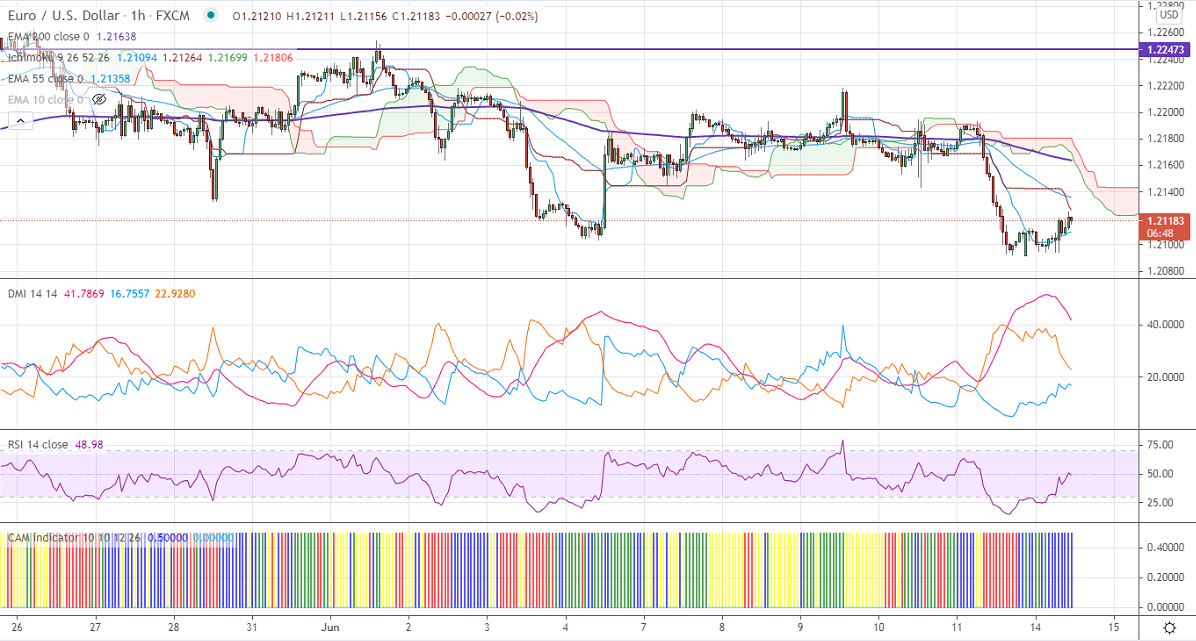 EURUSD has halted its three days of losing streak and shown a minor pullback. The pair declined drastically from a high of 1.22180 after upbeat US inflation. Markets eye Fed monetary policy and Chairman speech for further direction. The US-10 year bond yield has recovered some of its loss and jumped more than 3% from its low of 1.428%. DXY is holding above 90 levels. Any surge past 90.60 confirms further bullishness. EURUSD hits an intraday high of 1.21547 and is currently trading around 1.21180.